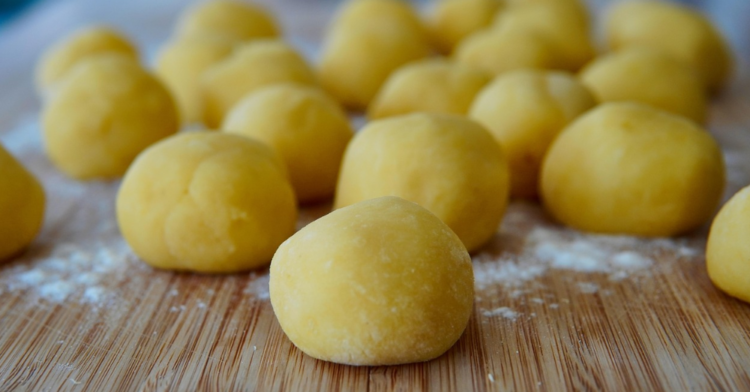- Přidáme mouku, vejce a sůl. Zpracujme hladké těsto, které nesmí být příliš lepivé. Z těsta vytvarujeme 2-3 válečky, nebo malé kulaté knedlíčky.