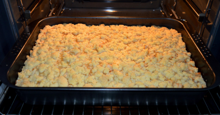 - Polovinu drobenky nasypeme na vymazaný a vysypaný plech, rozprostřeme na ní nastrouhaná jablka a přikryjeme zbytkem drobenky. Navrch můžeme pokapat trochou másla. Pečeme 30-35 minut na 180 stupňů. Posypeme moučkovým cukrem.