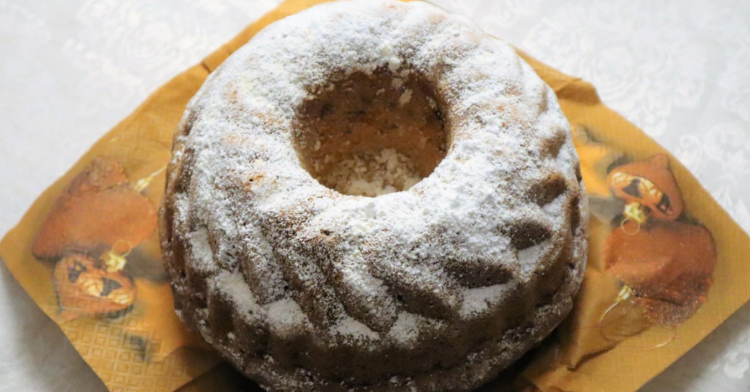- Těsto nalijeme do formy. Pečeme 40-45 minut na 170 stupňů, dokud špejle zapíchnutá do středu nevyjde suchá. Po upečení necháme pár minut vychladnout, vyklopíme a posypeme moučkovým cukrem.