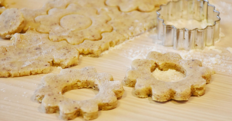 - Hotové těsto zabalíme do potravinářské folie a umístíme do lednice alespoň na 1 hodinu. Ideální je nechat ho v lednici přes noc. Těsto poté rozválíme, vykrojíme kolečka a pečeme 8-10 minut na 170 stupňů.
