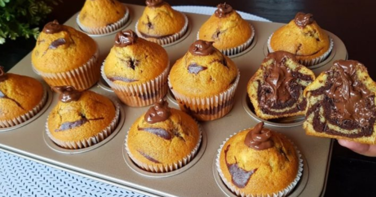 - Do formy na muffiny dáme košíčky. Nejdříve navrstvíme vanilkovou směs a poté kakaovou. Opakujeme, dokud nám nedojdou suroviny. Pečeme 20 minut na 180 stupňů. Naplníme nutellou.